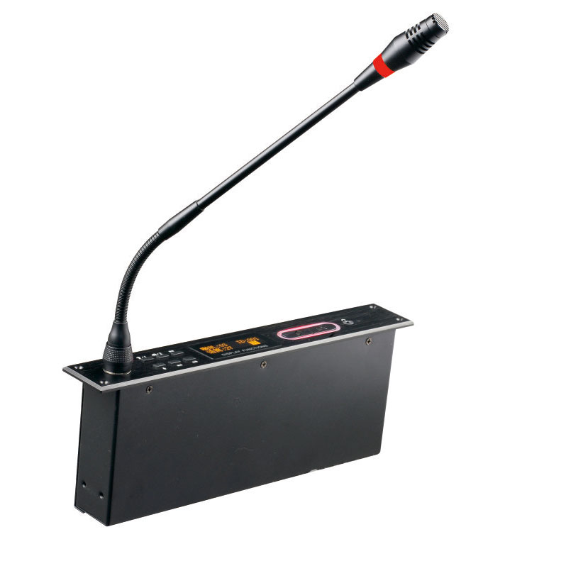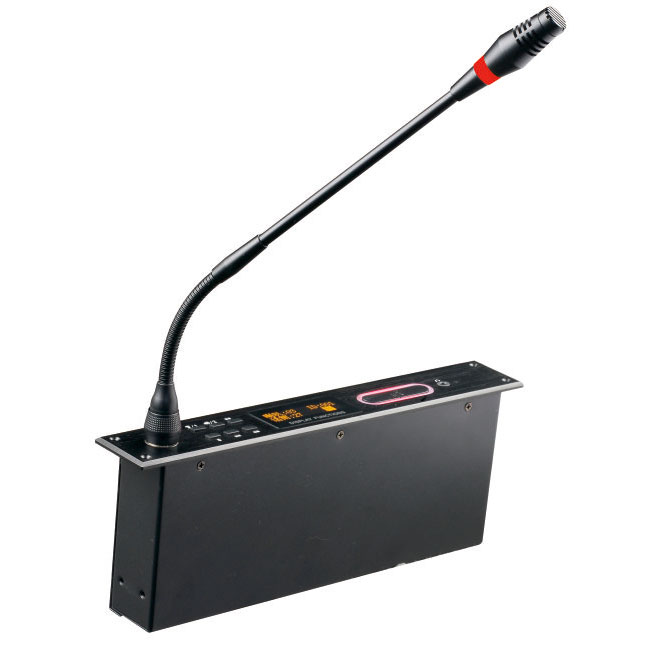 ◆ 符合IEC60194、GBT15381-94國際標準,高強度鋅合金壓鑄,外觀大氣沉穩。 ◆ 集發言、投票、按鍵簽到、表決功能于一體的會議發言單元。 ◆ 帶雙色指示燈環(紅色/白色),發言為紅色·咪頭外殼根據聲學原理設計,配合超指向性電容咪實現高度的人聲還原,帶聲頻啟動功能,發言時話筒自動打開。 ◆ 系統單元熱插拔功能,超強的抗手機干擾能力。 ◆ 具有消咳鍵,當發言人員咳嗽時,可暫時關閉麥克風,防止咳嗽聲傳到會場。 ◆ 具有話筒開關鍵,6個投票表決鍵,服務呼叫功能幫助鍵,中文簡體、繁體、英文菜單切換按鍵。 ◆ 高精度超亮度128*64LCD液晶屏,清晰顯示單元工作狀態,面板帶耳機輸出連接接口。 ◆ 本會議單元的ID號碼、申請發言人數、表決結果、簽到人數以及各種操作信息等內容。 ◆ 單元由主機供電,輸入電壓為24V,屬于安全電壓。 ◆ 主席單元具有優先鍵、批準鍵。支持連接電腦將代表話筒設置VIP話筒,VIP不受主席控制,連接位置不受限制。"手拉手"或"T型"連接模式